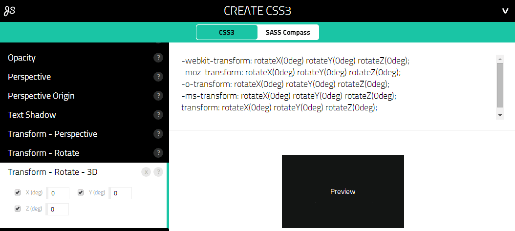Generate CSS3 and SASS Compass CSS3 code quickly and easily with Create CSS3. Generates CSS3 for all the major browsers (Safari, Chrome, ...